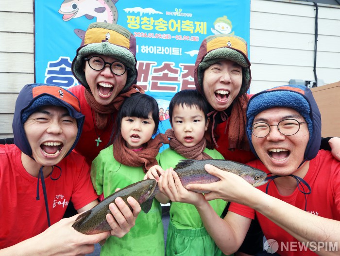 [서울=뉴스핌] 11일 휴일을 맞아 강원도 평창군 진부면 오대천 일원에 열린 대한민국 대표 겨울축제 '평창송어축제'를 찾은 방문객이 송어 맨손잡기 체험을 즐기고 있다. 개막 20주년을 맞는 올해 축제는 ‘겨울이 더 즐거운 송어 나라, 평창’이라는 주제 아래 메인 프로그램인 송어낚시를 넘어 전시·문화·휴식 콘텐츠를 강화한 겨울 종합 관광축제로 내달 9일 까지 방문객을 맞는다. [사진=평창군청] 2026.01.11 photo@newspim.com