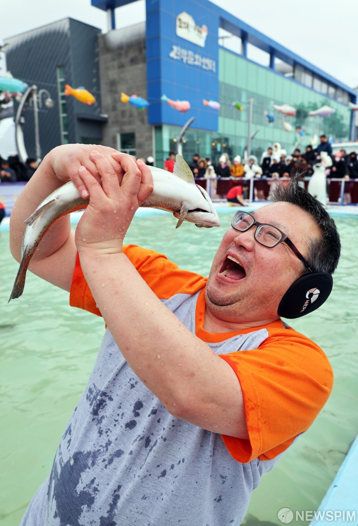 한파속 송어 맨손잡기 체험 즐기는 '평창송어축제' 참가자