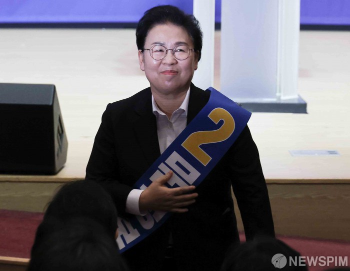 [서울=뉴스핌] 윤창빈 기자 = 문정복 더불어민주당 최고위원 후보가 11일 서울 여의도 국회 의원회관에서 열린 최고위원 보궐선거 후보자 합동연설회에서 인사를 하고 있다. 2026.01.11 pangbin@newspim.com