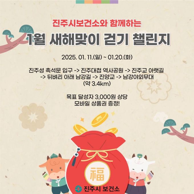 진주시는 매달 1회 이상 정기 걷기 챌린지를 진행하며, 진주성·남강변 등 지역 명소와 생활 속 걷기 좋은 길을 중심으로 코스를 운영할 계획이다. 첫 프로그램인 '새해맞이 걷기 챌린지'는 11일부터 20일까지 열리며, 진주성 촉석문 입구에서 남강 야외무대까지 약 3.4km 구간을 걷는 코스로 진행된다.