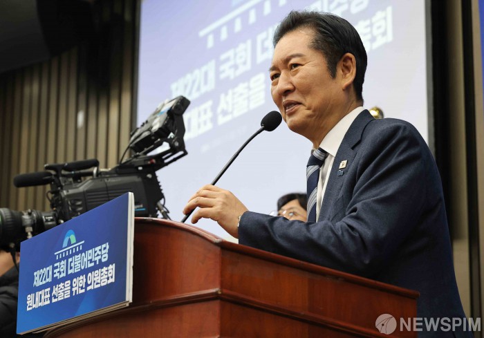 [서울=뉴스핌] 윤창빈 기자 = 정청래 더불어민주당 대표가 11일 서울 여의도 국회에서 열린 제22대 국회 더불어민주당 제2기 원내대표 선출 의원총회에서 모두발언을 하고 있다. 2026.01.11 pangbin@newspim.com