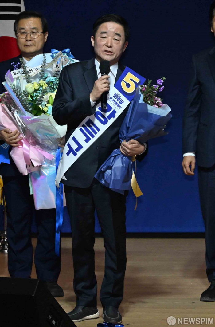 [서울=뉴스핌] 윤창빈 기자 = 더불어민주당 최고위원에 선출된 강득구 의원이 11일 서울 여의도 국회 의원회관에서 열린 최고위원 보궐선거 후보자 합동연설회에서 수락연설을 하고 있다. 2026.01.11 pangbin@newspim.com