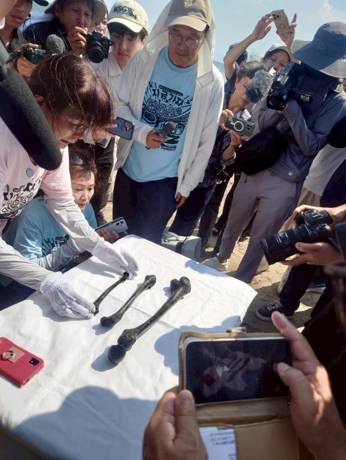 지난해 8월 26일 한일 민간단체 주도로 실시된 조세이 탄광 수몰 희생자 유해 발굴 작업에서 관계자들이 해저에서 발견된 유골을 수습하고 있다. [사진='조세이탄광 수몰사고를 역사에 새기는 모임' 홈페이지] 2025.08.26