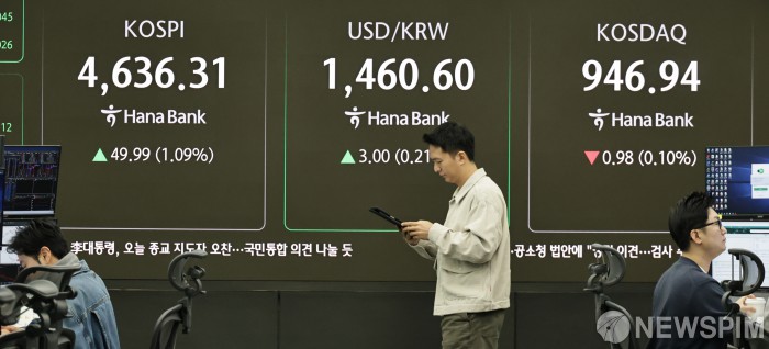 [서울=뉴스핌] 양윤모 기자 = 12일 오전 코스피가 전장 종가보다 49.99 포인트(1.09%) 상승하며 4636.31로, 코스닥은 0.98 포인트(0.10%) 하락한 946.94로 장을 시작한 가운데, 서울 중구 하나은행 딜링룸에서 직원들이 업무를 보고 있다. 서울외환시장에서 달러/원 환율은 전장 대비 3.00원 상승한 1460.60원에 주간거래를 시작했다. 2026.01.12 yym58@newspim.com