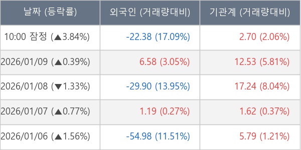 [서울=뉴스핌] 로보뉴스 = 12일 10시 15분 현재 대한전선(001440)은 전일 대비 3.84% (현재가 27,050원) 상승했고, 기관이 최근 7일 연속 순매수(누적 69.03만 주, 잠정) 행진을 하고 있다.