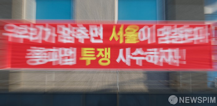 [서울=뉴스핌] 류기찬 기자 = 대법원의 통상임금 판결에 따른 임금 인상안을 두고 서울시버스운송사업조합(사측)과 대립해온 서울시버스노동조합(노조)이 파업 예고일을 하루 앞두고 막판 협상을 진행한다. 사측은 실무자급 협상에서 10%대 임금 인상률을 제안했고, 노조는 최소 12.85% 인상을 요구하고 있다. 사진은 12일 오전 서울 은평구 진관공영차고지에 총파업 관련 현수막이 붙어 있다. 2026.01.12 ryuchan0925@newspim.com