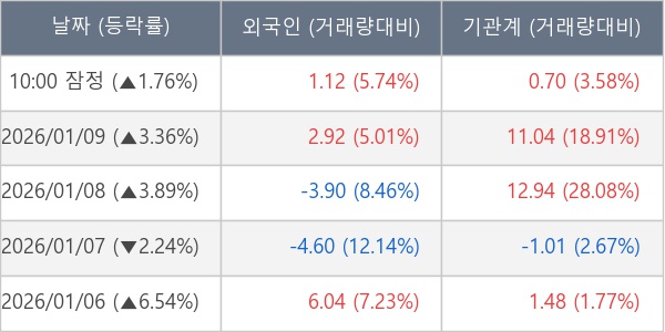 [서울=뉴스핌] 로보뉴스 = 12일 10시 15분 현재 엘앤에프(066970)는 외국인과 기관이 각각 1.12 만 주, 0.70 만 주 순매수(잠정) 하면서 전일 대비 1.76% (현재가 109,600원) 상승하고 있다.