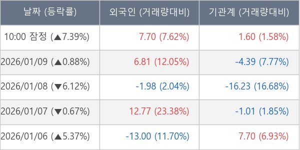 [장중수급포착] 우진, 외국인/기관 동시 순매수… 주가 +7.39%