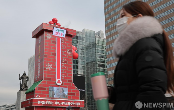 [서울=뉴스핌] 이길동 기자 = 12일 서울 종로구 광화문 광장에 설치된 사랑의 온도탑 나눔온도가 103.9도를 가리키고 있다. 사랑의열매 사회복지공동모금회는 이날 '희망 2026 나눔 캠페인'의 사랑의 온도탑 나눔 온도가 100도를 돌파했다고 밝혔다. 11일 자정까지 사랑의 열매를 통해 모두 4,676억 원이 모금돼 목표액인 4,500억 원의 103.9%를 기록했다. 2026.01.12 gdlee@newspim.com