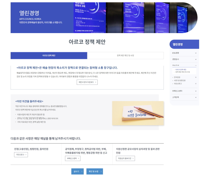 [서울=뉴스핌] 양진영 기자 = 한국문화예술위원회는 예술인이 예술 지원 정책에 대한 의견을 상시로 제안할 수 있는 온라인 소통 창구인 '아르코 정책 제안' 게시판을 기관 누리집에 개설했다.
