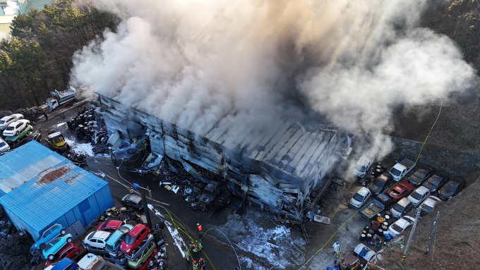 [거제=뉴스핌] 남경문 기자 = 12일 오전 7시52분께 경남 거제시 장평동 한 폐차장에서 불이 났다.