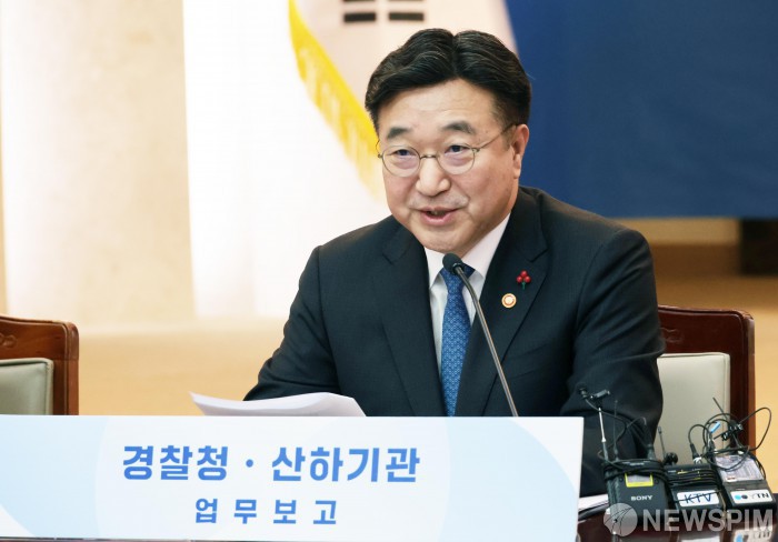 [서울=뉴스핌] 이길동 기자 =윤호중 행정안전부 장관이 12일 서울 종로구 정부서울청사에서 열린 경찰청,산하기관 업무보고에서 모두 발언을 하고 있다. 2026.01.12 gdlee@newspim.com