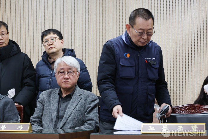 [서울=뉴스핌] 이형석 기자 = 박점곤 서울시버스노동조합 위원장(오른쪽)이 12일 오후 서울 영등포구 서울지방노동위원회에서 열린 특별조정위원회 사후 조정회의에서 자리하고 있다. 오른쪽 두 번째는 김정환 서울시버스운송사업조합 이사장. 2026.01.12 leehs@newspim.com