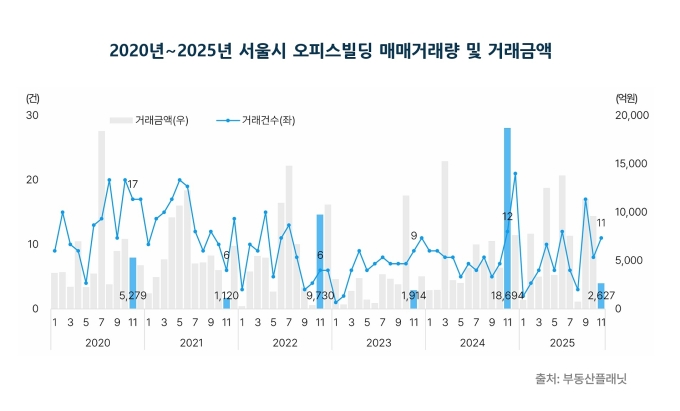 [서울=뉴스핌] 정영희 기자 = 지난해 11월 서울 오피스 매매시장이 거래금액 기준으로 큰 폭의 감소세를 보였다. 거래 건수는 일부 늘었지만 중소형 자산 위주의 거래가 이어지며 시장 위축이 두드러졌다. 강남권은 거래량 증가와 공실률 하락이 동시에 나타났다.