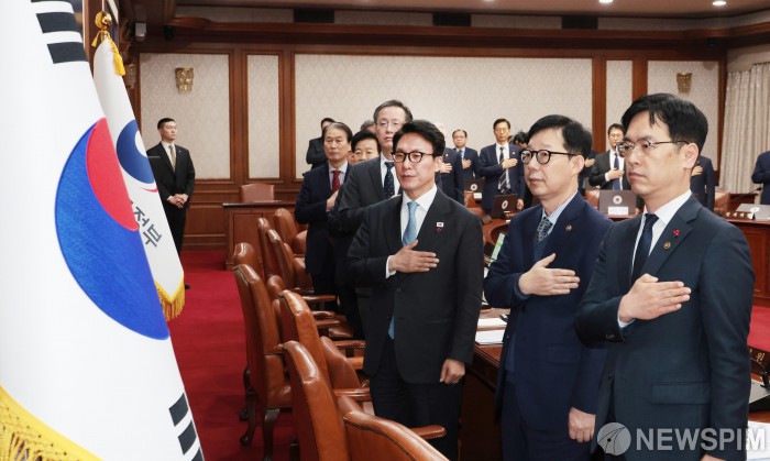 [서울=뉴스핌] 이길동 기자 = 김민석 국무총리가 13일 서울 종로구 정부서울청사에서 열린 국무회의에서 참석 국무위원들과 국기에 경례하고 있다. 2026.01.13 gdlee@newspim.com