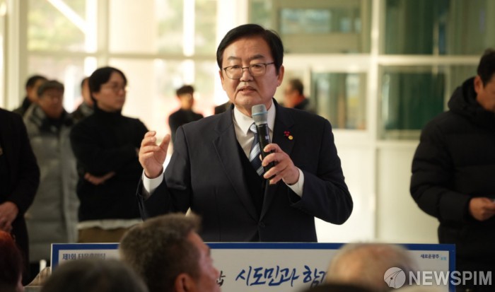 [광주=뉴스핌] 박진형 기자 = 문인 광주 북구청장이 13일 오전 광주시의회 1층 로비에서 열린 새로운광주포럼 제1회 타운홀미팅에서 기조 발제를 하고 있다. 2026.01.13 bless4ya@newspim.com