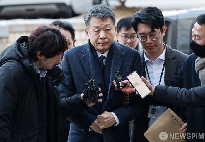 [서울=뉴스핌] 정일구 기자 = '홈플러스 사태'와 관련 사기 혐의를 받는 김광일 MBK파트너스 부회장 겸 홈플러스 공동대표가 13일 오전 서울 서초구 서울중앙지방법원에서 열린 구속 전 피의자 심문(영장실질심사)에 출석하고 있다. 2026.01.13 mironj19@newspim.com