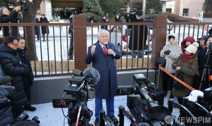[서울=뉴스핌] 양윤모 기자 =특수공무집행방해 교사 등의 혐의로 구속영장이 청구된 전광훈 사랑제일교회 목사가 13일 오전 서울서부지법에서 개최된 구속 전 피의자 심문(영장실질심사)에 출석하기전 법원 앞에서 기자회견을 하고 있다. 전 목사는 윤석열 전 대통령 지지자들을 부추겨 지난해 1월 19일 윤 전 대통령이 구속된 직후 영장을 발부한 서울서부지법에 난입해 집기를 부수고 경찰을 폭행하게 한 혐의를 받는다. 2026.01.13 yym58@newspim.com