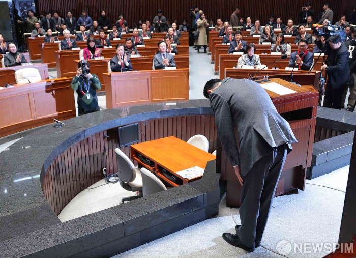 [서울=뉴스핌] 윤창빈 기자 = 장동혁 국민의힘 대표가 13일 서울 여의도 국회에서 열린 국회의원-당협위원장 연석회의 및 의원총회에서 모두발언을 마치고 인사하고 있다. 2026.01.13 pangbin@newspim.com