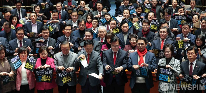 [서울=뉴스핌] 윤창빈 기자 = 장동혁 국민의힘 대표, 송언석 원내대표 및 소속 의원과 당협위원장들이 13일 서울 여의도 국회에서 열린 국회의원-당협위원장 연석회의 및 의원총회에서 더불어민주당 의원의 공천헌금 및 뇌물수수를 규탄하는 퍼포먼스를 하고 있다. 2026.01.13 pangbin@newspim.com