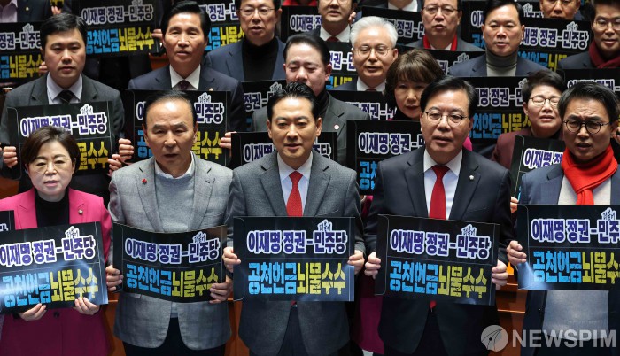 [서울=뉴스핌] 윤창빈 기자 = 장동혁 국민의힘 대표, 송언석 원내대표 및 소속 의원과 당협위원장들이 13일 서울 여의도 국회에서 열린 국회의원-당협위원장 연석회의 및 의원총회에서 더불어민주당 의원의 공천헌금 및 뇌물수수를 규탄하는 피켓팅을 하고 있다. 2026.01.13 pangbin@newspim.com