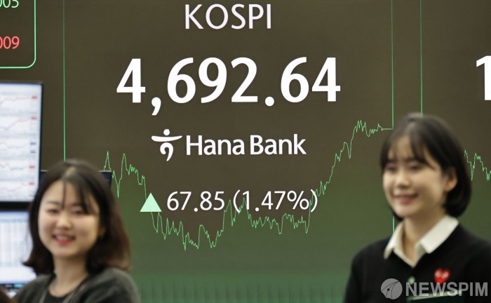 [서울=뉴스핌] 양윤모 기자 = 13일 오후 코스피가 전장 종가보다 67.85 포인트(1.47%) 상승하며 4692.64로, 코스닥은 0.83 포인트(0.09%) 하락한 948.98로 장을 마감한 가운데, 서울 중구 하나은행 딜링룸에서 직원들이 업무를 보고 있다. 서울외환시장에서 달러/원 환율은 전장 대비 5.80원 상승한 1474.30원에 주간거래를 마감했다. 2026.01.13 yym58@newspim.com