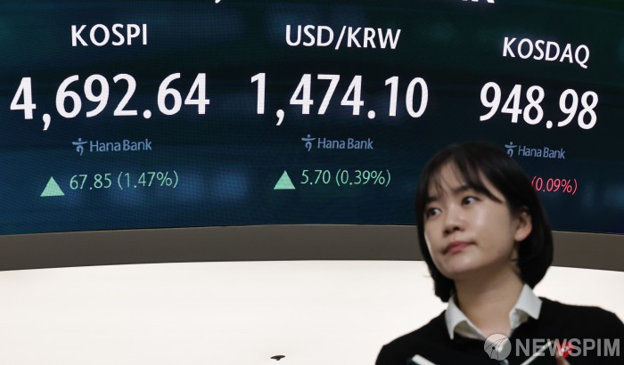 [서울=뉴스핌] 양윤모 기자 = 13일 오후 코스피가 전장 종가보다 67.85 포인트(1.47%) 상승하며 4692.64로, 코스닥은 0.83 포인트(0.09%) 하락한 948.98로 장을 마감한 가운데, 서울 중구 하나은행 딜링룸에서 직원들이 업무를 보고 있다. 서울외환시장에서 달러/원 환율은 전장 대비 5.70원 상승한 1474.10원에 주간거래를 마감했다. 2026.01.13 yym58@newspim.com