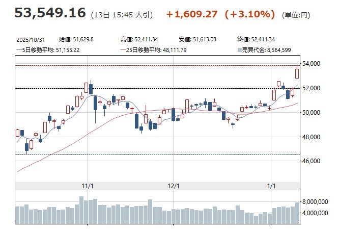 [서울=뉴스핌] 오영상 기자 = 13일 닛케이주가는 '다카이치 트레이드'가 재개되며 큰 폭으로 상승한 가운데, 사상 처음으로 5만3000엔 선을 돌파했다.