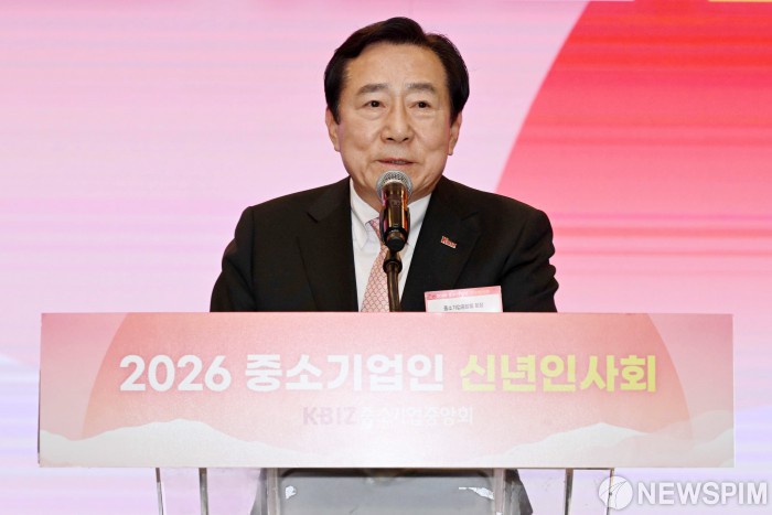 [서울=뉴스핌] 정일구 기자 = 김기문 중소기업중앙회장이 13일 오후 서울 영등포구 중소기업중앙회에서 열린 2026 중소기업인 신년인사회에서 신년사를 하고 있다. 2026.01.13 mironj19@newspim.com