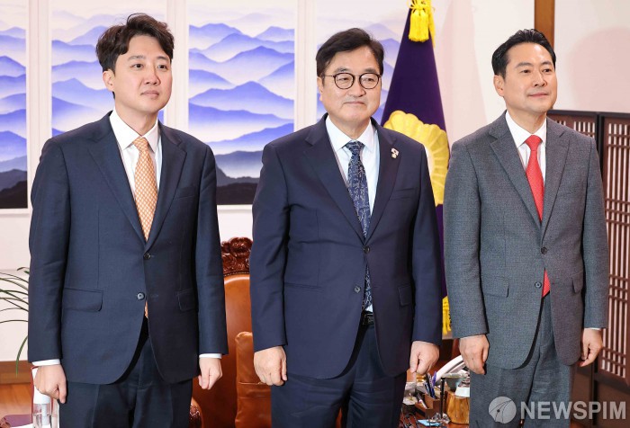 [서울=뉴스핌] 윤창빈 기자 = 우원식 국회의장(가운데), 장동혁 국민의힘 대표(오른쪽), 이준석 개혁신당 대표가 13일 서울 여의도 국회에서 공천비리·통일교특검 등을 논의하기에 앞서 기념촬영을 하고 있다. 2026.01.13 pangbin@newspim.com