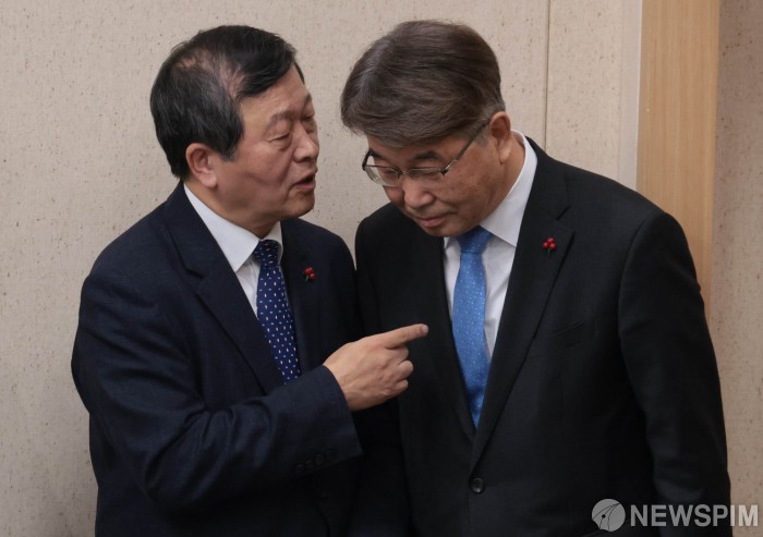 [서울=뉴스핌] 이길동 기자 = 김지형 경제사회노동위원회 위원장(오른쪽)과박수근 중앙노동위원회 위원장이 13일 서울 종로구 정부서울청사에서 열린 고용노동부-경사노위-중노위 정책간담회 사후 브리핑애 앞서 대화를 나누고 하고 있다. 2026.01.13 gdlee@newspim.com