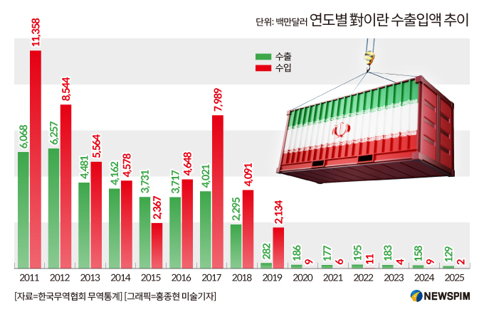 이는 이란과의 교역이 전성기를 이뤘던 지난 2011년과 비교하면 133분의 1 규모로 축소된 규모다. 사실상 교역이 거의 끊겼다고 봐도 무방한 수준이다(그래프 참고).