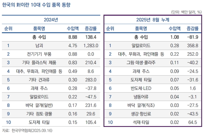 실제로 수출입 10대 품목을 보면, 대추나 무화과 등 과일을 비롯해 전기기기나 타일 등 일부 생필품들이 포함되어 있다(표 참고).