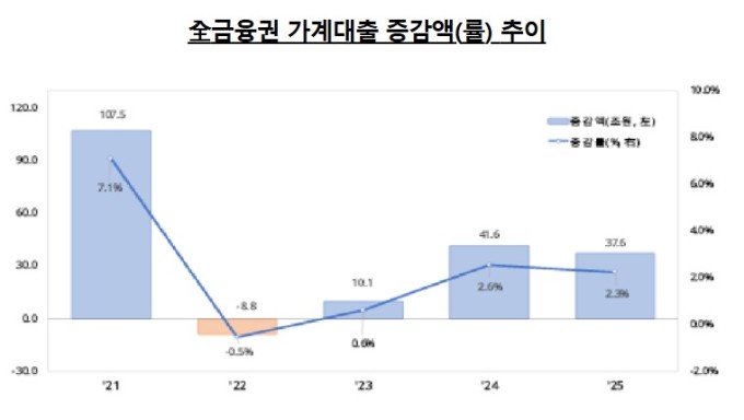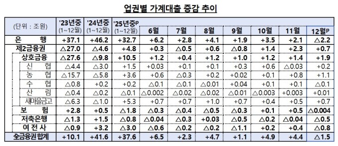 제2금융권 가계대출은 여전사(3조원 감소), 보험(1조8000억원 감소), 저축은행(8000억원 감소)은 감소한 반면, 상호금융권(+10조5000억원원)은 새마을금고(5조3000억원)를 중심으로 증가했다.