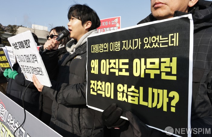[서울=뉴스핌] 양윤모 기자 = 전세사기·깡통전세 피해자 전국대책위원회가 14일 오전 청와대 분수대앞에서 이재명 대통령이 약속하고 지시한 전세사기 대책 이행을 촉구하는 기자회견을 개최했다. 2026.01.14 yym58@newspim.com