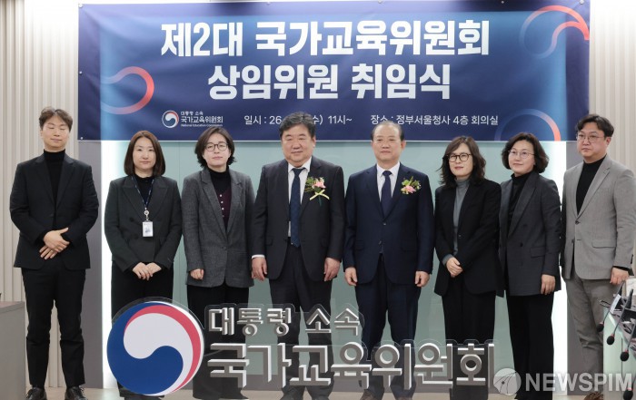 [서울=뉴스핌] 이길동 기자= 이광호(왼쪽 네번째부터), 김경회 국가교육위원회 상임위원 및 참석자들이 14일 서울 종로구 정부서울청사에서 열린 제2대 국가교육위원회 상임위원 취임식에서 기념촬영을 하고 있다. 2026.01.14 gdlee@newspim.com