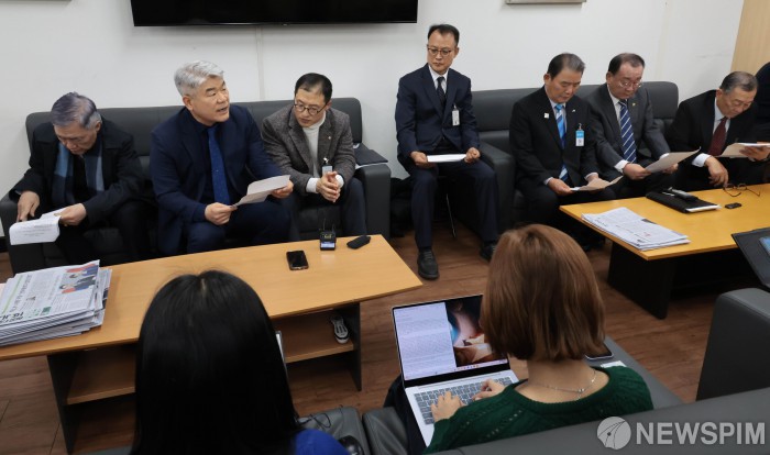 [서울=뉴스핌] 이길동 기자 = 김진향 한반도평화경제회의 의장(왼쪽 두번째 )등 남북경협기관·단체장들이 14일 오후 서울 종로구 정부서울청사 통일부 기자실을 찾아 '남북경협 기관·단체 남북관계 신뢰회복-평화복원' 기자회견을 하고 있다.2026.01.14 gdlee@newspim.com