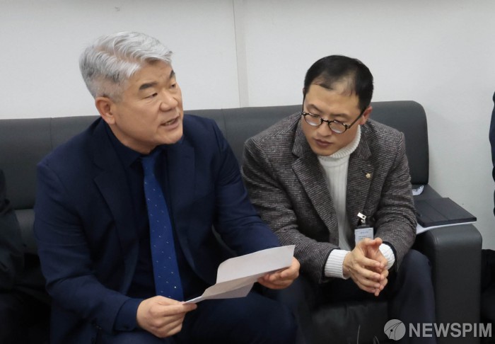 [서울=뉴스핌] 이길동 기자 = 김진향 한반도평화경제회의 의장(왼쪽)이 남북경협기관·단체장들과 함께 14일 오후 서울 종로구 정부서울청사 통일부 기자실을 찾아 '남북경협 기관·단체 남북관계 신뢰회복-평화복원' 기자회견을 하고 있다.2026.01.14 gdlee@newspim.com