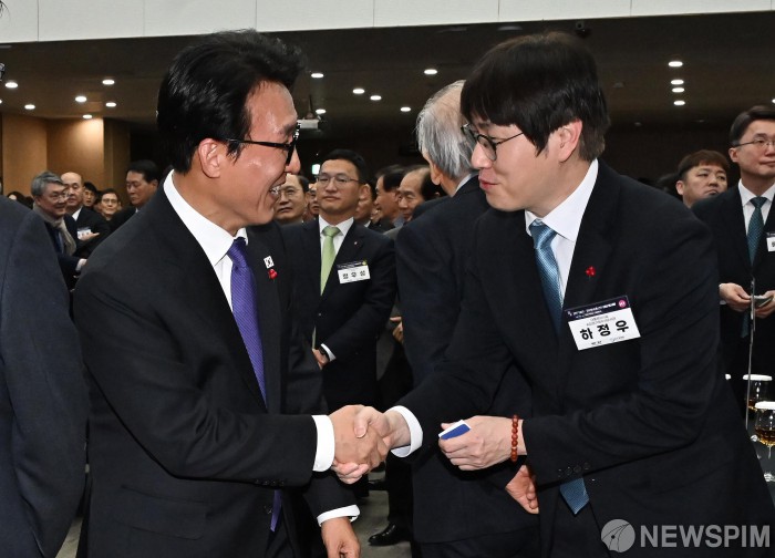 [서울=뉴스핌] 정일구 기자 = 김민석 국무총리가 14일 오후 서울 강남구 한국과학기술회관에서 열린 2026 과학기술인·정보방송통신인 신년인사회에서 하정우 대통령비서실 AI미래기획수석비서관과 악수하고 있다. 2026.01.14 mironj19@newspim.com