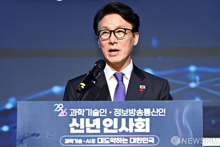 [서울=뉴스핌] 정일구 기자 = 김민석 국무총리가 14일 오후 서울 강남구 한국과학기술회관에서 열린 2026 과학기술인·정보방송통신인 신년인사회에서 인사말을 하고 있다. 2026.01.14 mironj19@newspim.com