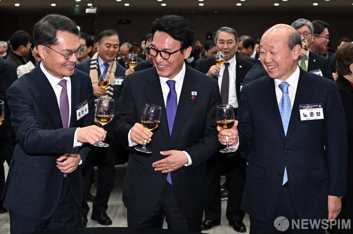 [서울=뉴스핌] 정일구 기자 = 김민석 국무총리가 14일 오후 서울 강남구 한국과학기술회관에서 열린 2026 과학기술인·정보방송통신인 신년인사회에서 참석자들과 건배하고 있다. 왼쪽부터 김민수 한국과학기술단체총연합회 회장 직무대행, 김 총리, 노준형 한국정보방송통신대연합회장. 2026.01.14 mironj19@newspim.com