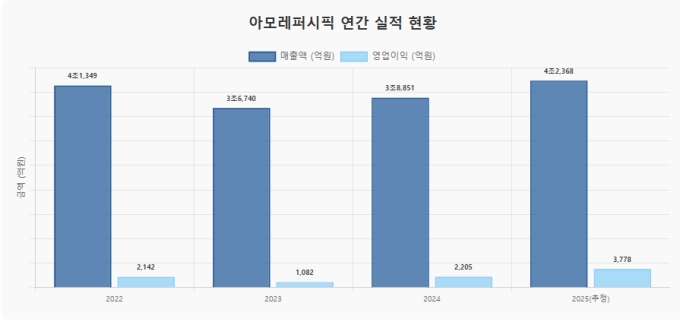 [서울=뉴스핌] 이성화 기자 = 최근 주력 사업인 화장품 부문에서 부진을 겪어 온 아모레퍼시픽이 2022년 이후 3년 만에 연 매출 4조원을 돌파하며 실적을 회복할 전망이다. 중국 시장 의존도를 낮추고 북미와 유럽 등 서구권 시장을 집중적으로 공략한 '글로벌 리밸런싱' 전략이 가시화 됐다는 평가가 나온다.