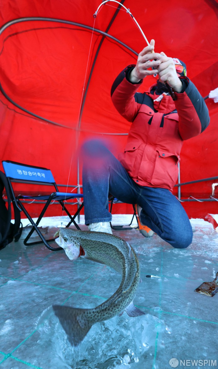 [서울=뉴스핌] 14일 강추위 속에 강원도 평창군 진부면 오대천 일원에 열린 평창송어축제를 찾은 방문객이 송어 얼음낚시를 즐기고 있다. ‘겨울이 더 즐거운 송어 나라, 평창’이라는 주제로 열린 올해 축제는 송어낚시를 넘어 전시·문화·휴식 콘텐츠를 강화한 겨울 종합 관광축제로 내달 9일 까지 방문객을 맞는다. [사진=평창군청] 2026.01.14 photo@newspim.com