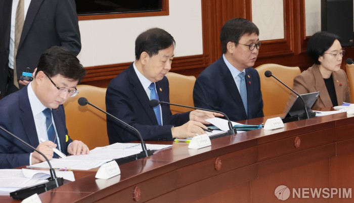 [서울=뉴스핌] 이길동 기자 = 15일 서울 종로구 정부서울청사에서 열린 국가정책조정회의에 참석한 구윤철 부총리 겸 재정경제부 장관(왼쪽 두번째)을 비롯한 참석자들이 김민석 총리의 모두 발언을 듣고 있다. 2026.01.15 gdlee@newspim.com
