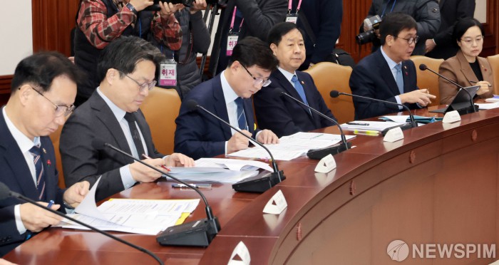 [서울=뉴스핌] 이길동 기자 = 15일 서울 종로구 정부서울청사에서 열린 국가정책조정회의에 참석한 구윤철 부총리 겸 재정경제부 장관(오른쪽 세번째)을 비롯한 참석자들이 김민석 총리의 모두 발언을 듣고 있다. 2026.01.15 gdlee@newspim.com