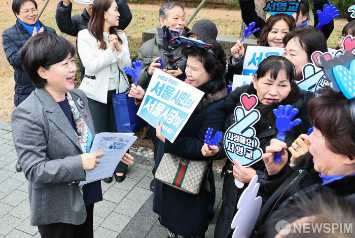 [서울=뉴스핌] 윤창빈 기자 = 서영교 더불어민주당 의원이 15일 서울 여의도 국회에서 6.3 지방선거 서울시장 출마 선언을 하기 위해 들어서며 지지자들의 응원을 받고 있다. 2026.01.15 pangbin@newspim.com