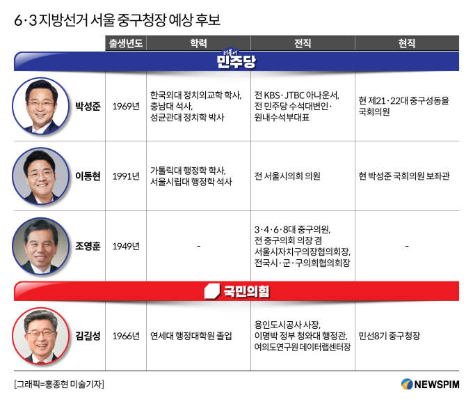 서울 중심에 자리한 중구에서는 국민의힘 소속 김길성 구청장이 재선에 도전하는 가운데 더불어민주당에서 박성준 중구·성동구을 국회의원, 이동현 전 서울시의회 의원, 조영훈 전 중구의회 의장 등이 후보로 거론된다.