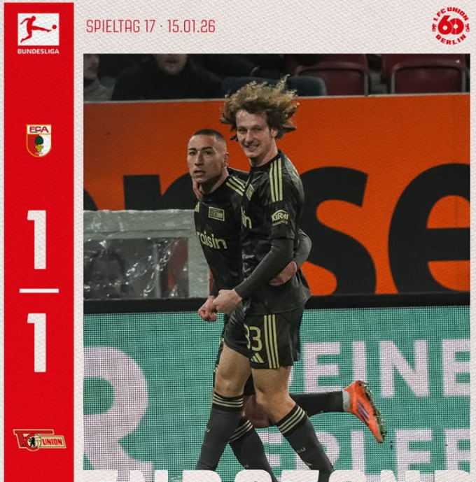 우니온 베를린은 16일(한국시간) 독일 아우크스부르크의 WWK 아레나에서 열린 2025-2026시즌 분데스리가 17라운드 원정 경기에서 아우크스부르크와 1-1로 비겼다.