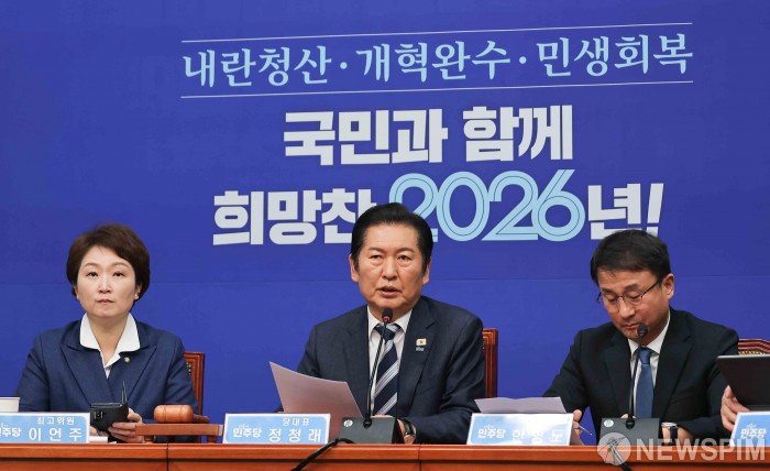 [서울=뉴스핌] 윤창빈 기자 = 정청래 더불어민주당 대표가 16일 서울 여의도 국회에서 열린 최고위원회의에서 모두발언을 하고 있다. 2026.01.16 pangbin@newspim.com