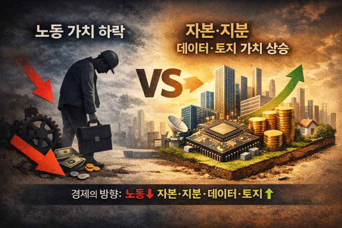 AI 시대의 핵심 변화는 노동소득의 상대적 가치 하락이다. 이는 사람들이 덜 일하게 된다는 의미가 아니다. 오히려 더 많이, 더 효율적으로 일해야 같은 가치를 유지할 수 있는 구조다. 반면 자본, 지분, 데이터, 토지처럼 '소유 가능한 자산'의 가치는 지속적으로 강화된다.